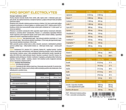 Hydratuj tělo. Dobij výkon. Zrychli regeneraci. Na výrobu až 60 litrů kvalitního multi-sportovního nápoje. Tento komplexní doplněk stravy byl vytvořený pro každého, kdo bere svůj výkon vážně. Ať už jsi vytrvalostní běžec, silový atlet, nebo si jen rád užíváš aktivní život. Speciálně navržený mix elektrolytů a živin ti pomůže dosáhnout tvých cílů. Proč PRO SPORT ELECTROLYTES funguje? Naše odborné a ze zkušeností sportovců vycházející složení jde daleko za rámec běžných elektrolytů. Kromě klíčových minerálů pro hydrataci, jako je sodík, hořčík, draslík a vápník, obsahuje tento produkt další pečlivě vybrané složky. Rychlá energie: Směs maltodextrinu, dextrózy a fruktózy poskytuje okamžitou a dlouhotrvající energii pro udržení intenzivního výkonu. Komplexní regenerace: Obsah L-glutaminu a klíčových EAA s vysokým obsahem volných aminokyselin BCAA (L-leucin, L-isoleucin, L-valin) je klíčovou silou pro podporu svalové regenerace, snížení únavy a ochranu svalové hmoty. Antioxidační ochrana: S extraktem ze zeleného čaje (40% EGCG) a kyselinou alfa-lipoovou poskytuje silnou antioxidační podporu, která pomáhá tělu bojovat proti volným radikálům. Klíčové vitamíny a minerály: Vitamin C, vitamin E a zinek podporují imunitu, správnou funkci svalů a celkové zdraví. Jak PRO SPORT ELECTROLYTES použít Pro výrobu kvalitního nápoje se držte návodu, který je uveden v doporučeném dávkování. Jednoduše si rozmíchej jednu dávku ve vodě během tréninku nebo po něm. Následně pocítíš okamžitý rozdíl v hydrataci. PRO SPORT ELECTROLYTES může být tvým parťákem na cestě k lepším výkonům. Složení, které mluví za vše: Energetická podpora: Sacharidová směs (maltodextrin, dextróza, fruktóza) je navržena tak, aby poskytovala energii v různých fázích trávení. Výzkum ukazuje, že kombinace různých typů sacharidů (např. glukózy a fruktózy) může optimalizovat jejich vstřebávání a oxidaci, což vede ke zvýšené dostupnosti energie a lepšímu výkonu při dlouhodobé zátěži. Nejdůležitější je ideální obsah poměru dextrózy a fruktózy 1:0,8, který využívá jejich odlišné transportní mechanismy ve střevech (glukóza se vstřebává pomocí SGLT1, fruktóza pomocí GLUT5). Kombinace těchto dvou monosacharidů zvyšuje rychlost jejich vstřebávání (až 1,7 g/min oproti 1 g/ min jen pro glukózu). Komplexní regenerace: Obsah klíčových aminokyselin BCAA (L-leucin, L-isoleucin, L-valin) - Studie publikované v odborných časopisech, jako je např.: Journal of the International Society of Sports Nutrition, poukazují, že doplňování BCAA může pomoci snížit poškození svalů způsobené cvičením, urychlit regeneraci a zmírnit svalovou bolest. L-glutamin je pak esenciální aminokyselina, která se podílí na imunitních funkcích a regeneraci střevní stěny. Antioxidační ochrana: Extrakt ze zeleného čaje (40% EGCG) s kyselinu alfa-lipoovou (ALA). Epigallocatechin gallát (EGCG) ze zeleného čaje je silný antioxidant, který pomáhá chránit buňky před oxidačním stresem. ALA je proslulá svou schopností recyklovat další antioxidanty, jako je vitamín C a E, a její účinky na sportovní výkon jsou předmětem mnoha studií. Vylepšená absorpce a využití živin: Přítomnost citrátů (sodný, hořečnatý, draselný, vápenatý) zajišťuje, že klíčové minerály jsou ve formě, která je pro tělo snadno vstřebatelná, což je klíčové pro rychlou hydrataci a správnou funkci svalů. Zinek ve vysoce biodostupné formě bisglycinátu pak přispívá k udržení normální hladiny testosteronu a podporuje imunitní systém. Tato pokročilá směs elektrolytů, aminokyselin, vitamínů a rostlinných extraktů dodává tělu přesně to, co potřebuje – rychlou hydrataci, energetickou podporu, lepší regeneraci svalů a ochranu před oxidačním stresem. Schválená zdravotní tvrzení pro jednotlivé složky: Vitamin C (kyselina L-askorbová) přispívá k normální funkci imunitního systému, ochraně buněk před oxidačním stresem, ke snížení míry únavy a vyčerpání, normální psychické činnosti a ke správné tvorbě kolagenu pro normální funkci kostí, chrupavek, kůže, zubů, dásní, cév. Vitamin E (dl-alfa-tokoferyl acetát) přispívá k ochraně buněk před oxidačním stresem. Hořčík (citrát, malát) přispívá ke snížení míry únavy a vyčerpání, k elektrolytické rovnováze, normální činnosti svalů a nervové soustavy a přispívá k normálnímu energetickému metabolismu. Vápník (citrát vápenatý) přispívá k normální činnosti svalů, je potřebný pro udržení normálního stavu kostí a zubů, energetickému metabolismu. Zinek (bisglycinát zinečnatý) přispívá k normální funkci imunitního systému, ochraně buněk před oxidačním stresem, k normální plodnosti a reprodukci a přispívá k normálnímu metabolismu sacharidů, mastných kyselin a bílkovin. Draslík (fosforečnan draselný, citrát draselný) přispívá k normální činnosti nervové soustavy, normální činnosti svalů. Sodík (citronan sodný, NaCl) přispívá k udržení elektrolytické rovnováhy, synergií ve směsi s hořčíkem, draslíkem. Špičkově navržená formule elektrolytů nové generace – pro náročné tréninky, extrémní výkony i každodenní vitalitu. Odkaz na několik odborných studií: EGCG (extrakt z čajovníku čínského) – zlepšení VO2max Název studie: Epigallocatechin-3-gallate increases maximal oxygen uptake in adult humans Autoři: Richards JC, Lonac MC, Johnson TK, Schweder MM, Bell C Publikace: Metabolism – Clinical and Experimental, 2010 Závěr: 7denní suplementace EGCG (135 mg/den) vedla k významnému zlepšení VO2max u zdravých dospělých. BCAA + elektrolyty při běhu – ochrana sva