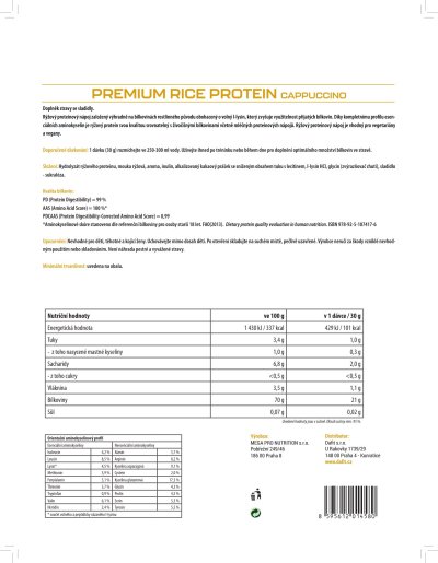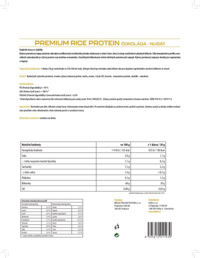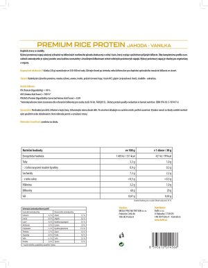 Vysoce kvalitní rýžový proteinový koncentrát doplněný o volný l-lysin. Proteinový nápoj obsahuje 70 % bílkovin výhradně z rýže, je přirozeně bez lepku a laktózy a neobsahuje umělá barviva. Díky kompletnímu profilu esenciálních aminokyselin je rýžový protein svou kvalitou srovnatelný s živočišnými bílkovinami včetně mléčných proteinových nápojů. Aminokyselinové spektrum doplněné o volný l-lysin Rýžová bílkovina má přirozeně nízký obsah l-lysinu, čímž klesá celková využitelnost bílkoviny pro lidský organismus. V receptuře PREMIUM RICE PROTEINu je proto l-lysin přidaný ve volné formě, aby zastoupení esenciálních aminokyselin bylo plnohodnotné. Díky vysoké proteinové stravitelnosti se tak proteinový nápoj může pyšnit vynikajícím skóre kvality bílkovin (PDCAAS = 0,99), které odpovídá těm nejkvalitnějším proteinovým nápojům na trhu. Rýžový proteinový nápoj je vhodný pro vegetariány a vegany.