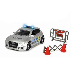 Policejní auto Audi RS3 na setrvačník, se světelnými a zvukovými efekty a otevíracími dveřmi. Příslušenství - zastavovací pás, dopravní kužely, zábrana. Velikost 15 cm, měřítko 1:32. Česká verze.