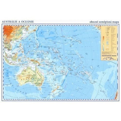 Příruční mapa praktického formátu nabízí přehledné zpracování obecného zeměpisu Austrálie a Oceánie. Kromě základního horopisu a vodopisu přináší i výrazné vyznačení hlavních měst. Na druhé straně se nachází obrysová mapa, kde si uživatel může vyzkoušet znalosti načerpané na přední straně. Mapa v praktickém formátu je vhodná jako podložka na stůl nebo jako praktický doplněk na cesty.Měřítko 1 : 42 000 000 oboustranná mapa