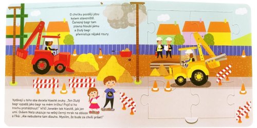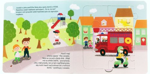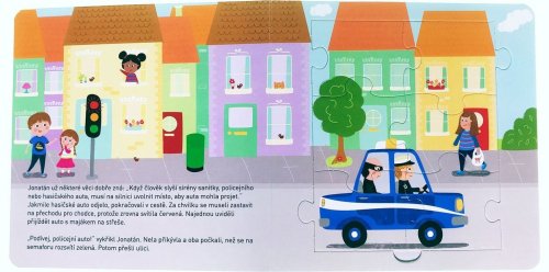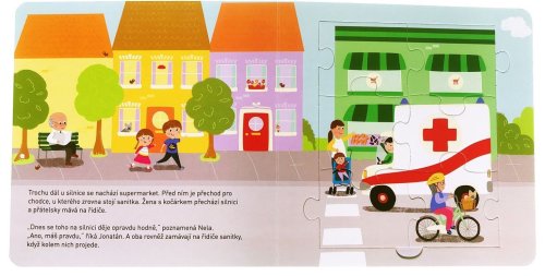Prozkoumej město, kde bydlí Nela s Jonatánem, a zjisti, jaká auta tam jezdí. U toho můžeš skládat puzzle, které dohromady tvoří jeden velký obrázek! Pět menších skládaček o šesti dílcích se dá spojit do jednoho velkého, 30dílkového puzzle. Pod každou skládačkou se skrývají hádanky a otázky k příběhu Nely a Jonatána, kteří žijí ve městě, kde jezdí spousta různých aut. Spolu s dětmi a dopravními prostředky mohou zvídavé děti prozkoumávat město a vše, co v něm jezdí.
