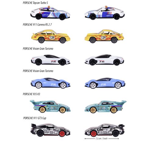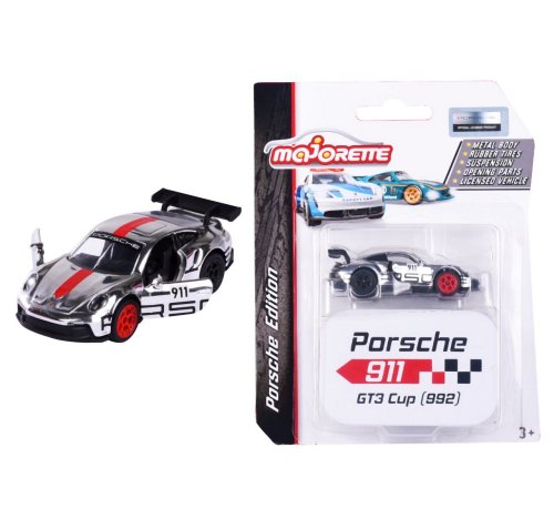 Kovové sportovní auto Porsche na volnoběh, gumové pneumatiky, otevírací části, sběratelská kovová krabička součástí. Měřítko 1:64, délka 7,5 cm