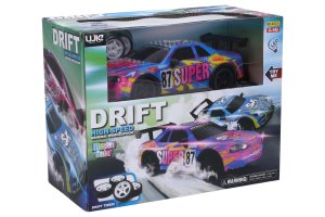 Auto 87 Super driftující svítící RC na dálkové ovládání. Rozměry 20x8x6 cm. Frekvence 2.4GHz. Pistolový ovladač. Součástí 4 standardní a 4 driftující kola. Světelné efekty povrchu auta tlačítkem na ovladači. Bateriový pack 3.7V 500mAh lithium do auta součástí, 2xAA do ovladače nejsou součástí. Try Me tlačítko pro světelné efekty v obalu - 3xAG13 baterie (neměnitelné) součástí. Při vybalování nutno odpojit Try Me kabel z auta. USB kabel součástí. Rychlost 12 km/h. Provoz až 20 min, nabíjení 2 h, dosah až 40 m. Přepínač ON/OFF na spodní straně auta a na ovladači.
