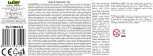 Auto 9 Champion svítící dýmící RC na dálkové ovládání. Rozměry 19x8x6 cm. Frekvence 2.4GHz. Světelné efekty povrchu auta. Dýmící efekty. Bateriový pack 3.7V 500mAh do auta součástí, 2xAA do ovladače nejsou součástí. USB kabel součástí. Přepínač ON/OFF na spodní straně obalu. Ovladač - přepínač ON/OFF, tlačítko - dýmící efekty, tlačítko - zvukové efekty. Nádržka na vodu v zadní části auta před křídlem.