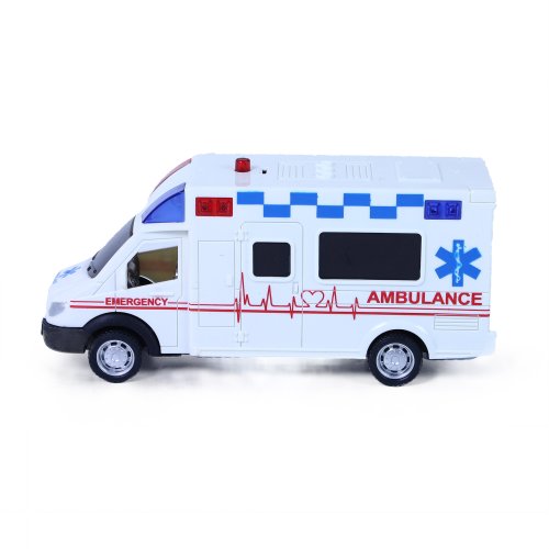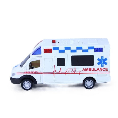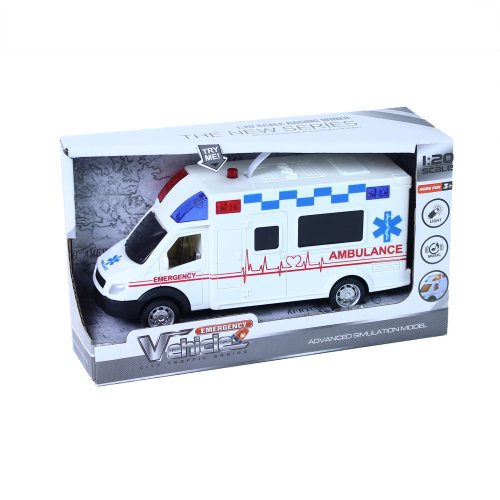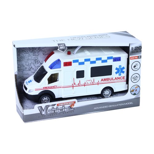 Pacient potřebuje tvoji pomoc, záchranná akce právě začíná! Sanitka po stlačení tlačítka na střeše vozu vydává reálné zvuky a bliká. Autíčko v délce 18 cm je na baterie, které jsou jeho součástí.