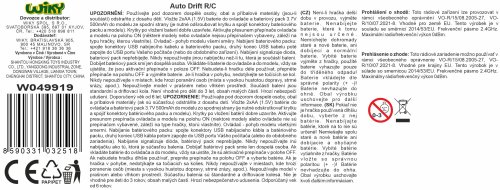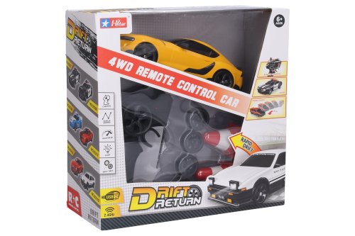 Auto Drift Return RC na dálkové ovládání. Rozměry 19x9x6 cm. Frekvence 2.4GHz. Pistolový ovladač. Součástí 4 standardní a 4 driftovací kola, kužely. Světelné efekty. Bateriový pack 3.7V 500mAh do auta součástí, 2xAA do ovladače nejsou součástí. USB kabel součástí. Provozní doba až 20 min, nabíjení 80 min. Přepínač ON/OFF na spodní straně auta a na ovladači.