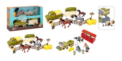 Sada farmářské auto s přívěsným vozíkem, včetně figurek zvířat, lidí a dalšího příslušenství. Sada obsahujei šroubovák na montáž kol, děti tak trénují jemnou motoriku.