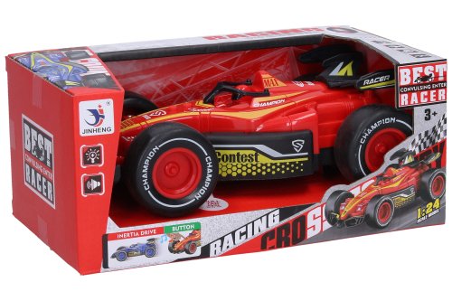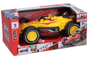 Auto formule na setrvačník s efekty. Rozměry 21,5x11,5x7,5 cm. Vydává světelné a zvukové efekty. Aktivace tlačítky v přední části formule - zvuk startu motoru a startovních světel, zvuk jízdy. 3 varianty - žlutá, červená, modrá. Baterie 3xAG13 1,5 V, součástí balení.