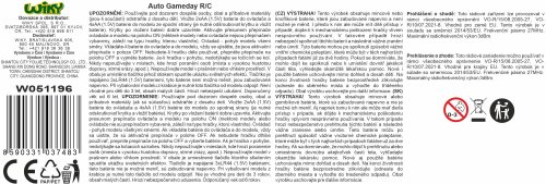 Auto Gameday svítící RC na dálkové ovládání. Rozměry 24x10,5x8,2 cm. Frekvence 27MHz. Světelné efekty povrchu auta. 4xAA baterie do auta, 2xAA do ovladače nejsou součástí. Try Me tlačítko pro světelné efekty v obalu - 3xAG13 baterie (neměnitelné) součástí. Při vybalování nutno odpojit Try Me kabel z auta. Rychlost 10 km/h. Dosah až 20 m. Přepínač ON/OFF na spodní straně auta.