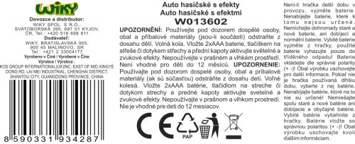 Auto hasičské s efekty. Velikost 15cm. Volná kola. Světelné a zvukové efekty. 2xAAA baterie součástí. Tlačítkem na střeše se spouští zvuky startování, houkání, blikají majáky. Dotykem na střeše a na kapotě se spouští melodie.