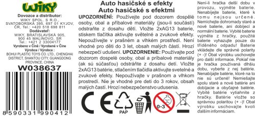 Auto hasičské s efekty a 6 malými auty. Rozměry velkého auta 34x12,5x18,5 cm, velikost malých aut 7-8 cm. Volná kola. Světelné a zvukové efekty, aktivace červeným tlačítkem na kabině. 2xAG13 baterie součástí. Obsahuje velké auto, 6 malých aut, semafor, fotobuňku, kužel, závoru.
