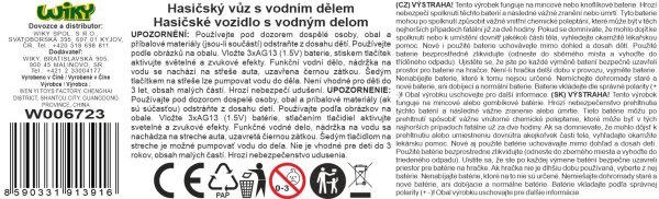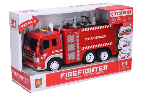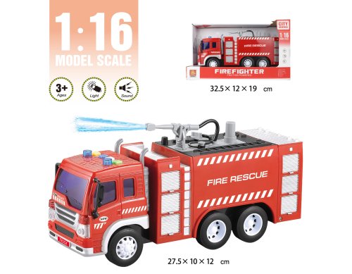 Hasičský vůz s vodním dělem, 27 cm. 4 tlačítka s různými světelnými a zvukovými efekty. Funkční vodní dělo. Nádržka na vodu se nachází na střeše auta, uzavřená černou zátkou. Šedým tlačítkem na střeše se pumpuje voda do vodního děla. 3xAG13, součástí. Try me funkce na obalu.