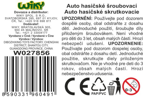 Auto hasičské šroubovací. Rozměry 14,5x11x15 cm. 4 varianty. Volná kola. Obsah balení - auto a šroubovák.