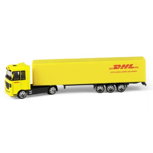 Pořiď si tento originální kamion s logem přepravní společnosti DHL a rozšiř si tímto svůj vozový park! Model kamionu 1:87 je vyroben z kovu, přívěs je vyroben z PVC. Model jezdí na volný chod. Tahle unikátní hračka nadchne všechny kluky! Velikost auta: 19 cm Rozměr balení: 20 x 6 x 4 cm Vhodné pro děti od 3 let