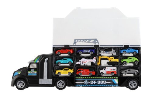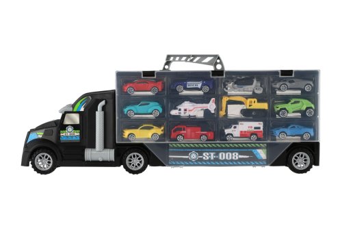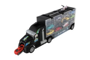 Velký kamion přepravník s volným chodem potěší všechny malé milovníky aut! Kamion slouží jako úložný box a zároveň jako herní set – uvnitř se ukrývá prostor pro uložení mnoha dopravních prostředků, které lze snadno převážet i vystavovat. Přední i zadní rampa umožňuje pohodlný vjezd i výjezd autíček, a díky madlu lze kamion jednoduše přenášet. Nechybí ani přistávací plocha pro vrtulník – ideální hračka na cesty i na doma! Velikost hračky: 50 cm