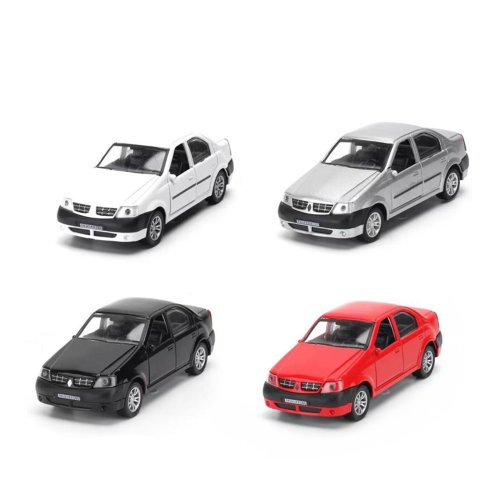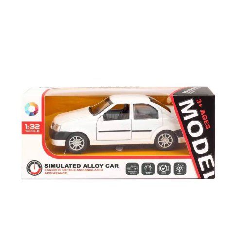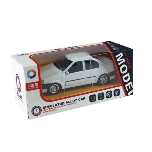 Kovové autíčko s otevíracími dveřmi, při zatlačením na auto, vydává různé zvuky a svítí. Auto jezdí na zpětný setrvačník. Obsahuje 3 ks baterií typu AG13/LR44.