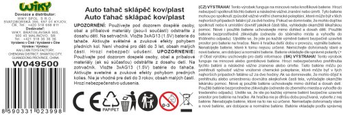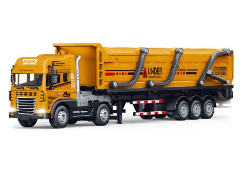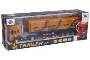 Auto kovové tahač sklápěč na setrvačník s efekty. Délka 42 cm. Na setrvačník. Vydává světelné a zvukové efekty. Aktivace pohybem předních kol. Páčka na uzamčení návěsu. Návěs je možné odpojit. Baterie 3xAG13, součástí balení.