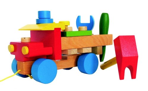 Dřevěné tahací montážní auto je složené z montážních částí a přiloženého dřevěného nářadí.