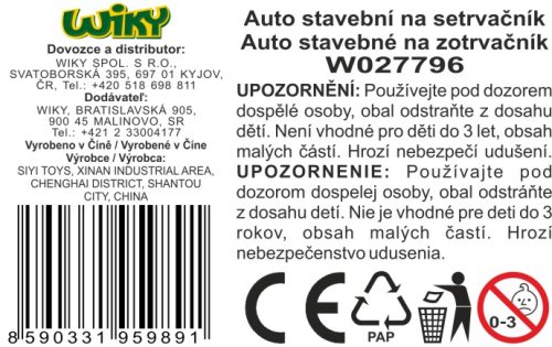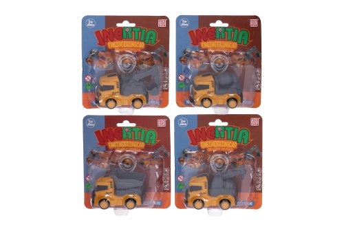 Auto stavební. Rozměry 8,5x5x5,5 cm. Na setrvačník. 4 varianty - sklápěč, domíchávač, jeřáb, bagr.