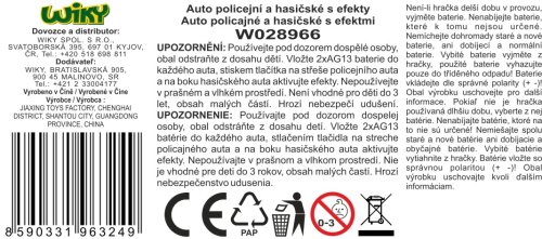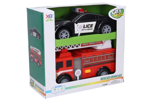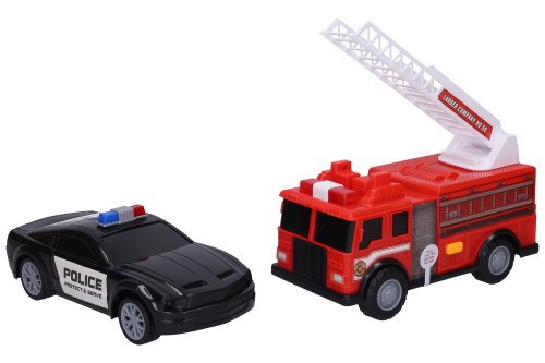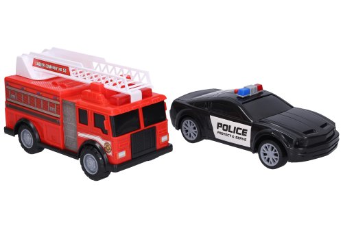 Auta policejní a hasičské s efekty. Velikost 23 cm. Volná kola. Světelné a zvukové efekty tlačítkem na střeše policejního auta a tlačítkem na levém boku hasičského auta. 2xAG13 baterie pro každé auto (4xAG13 celkem), součástí.