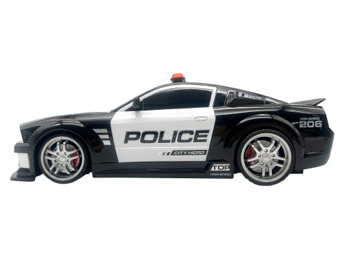 Auto policejní City Hero RC na dálkové ovládání. Velikost 32 cm. Frekvence 2.4GHz. Pistolový ovladač. Světelné efekty. Bateriový pack 7.4V 500mAh Li-ion do auta součástí, 2xAA do ovladače nejsou součástí. USB kabel součástí. Přepínač ON/OFF na spodní straně auta a na ovladači.