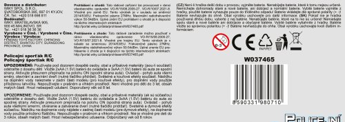 Auto policejní RC na dálkové ovládání. Velikost 21 cm. Frekvence 27MHz. Dálkově otevírací dveře. Světelné a kouřové efekty. 3xAA baterie do auta, 2xAA do ovladače nejsou součástí. Přepínač ON/OFF na spodní straně auta. Tlačítko na ovladači - otevírání dveří. Nádrž v zadní části před křídlem. Nádobka na vodu součástí.