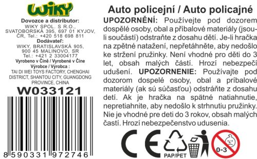 Auto policejní kovové. Rozměry 12x5,3x3,8 cm. Na zpětné natažení. Otevírací dveře. 2 varianty - černá, bílá.