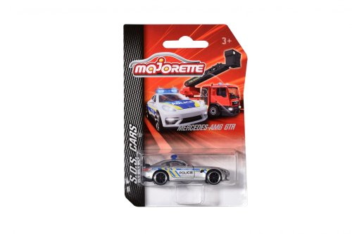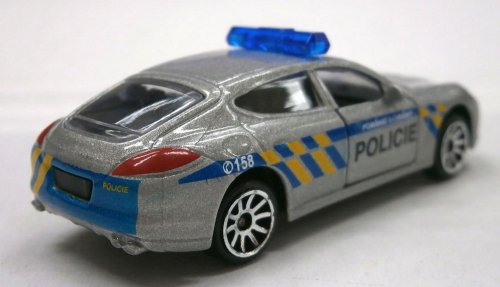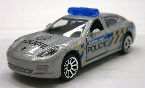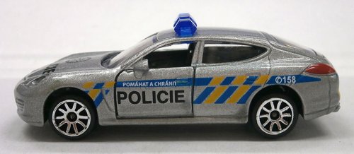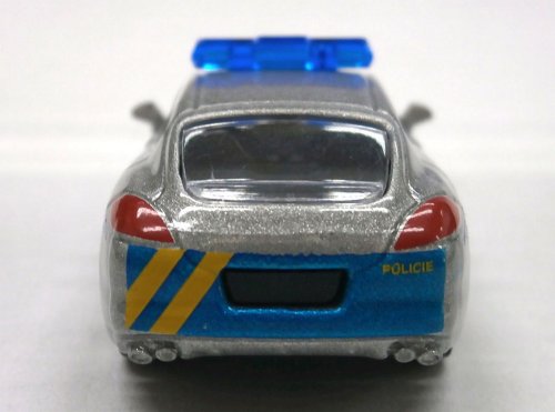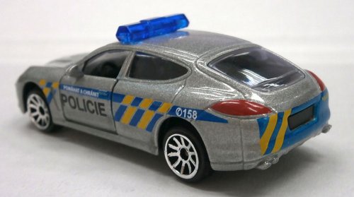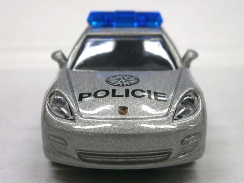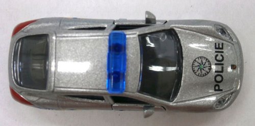 Kovové policejní auto na volnoběh. Pohyblivé a/nebo otevírací část. Délka 7,5 cm.