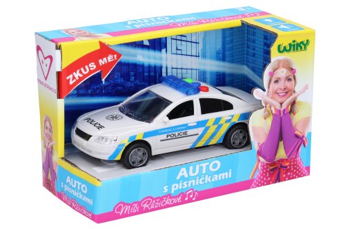 Auto policejní - Míša Růžičková. Velikost 15,5 cm. Na setrvačník. Světelné a zvukové efekty, tlačítky na střeše auta 3 písníčky Míši Růžičkové - Policejní, Sanitka, Popeláři. 3xAG13 baterie součástí.