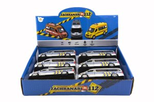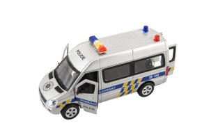 Kovové autíčko pro malé policisty je vyrobeno s plastovými doplňky. Malý model jezdí na zpětné natažení, má otevírací přední a zadní dvěře, vydává zvuky startování a houkačky, má efekty blikajících světel. Kupte dětem policejní vůz! Velikost dodávky je 15cm. Baterie 3 x AG13 jsou součástí balení a slouží pouze pro zkušební účely. Rozměry výrobku 15cm. Vhodné pro děti od 3 let.