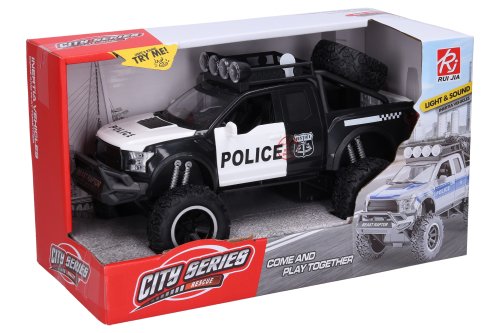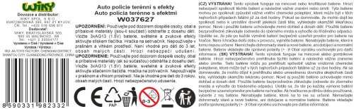 Auto policie terénní s efekty. Velikost 26 cm. Vydává světelné a zvukové efekty. Aktivace tlačítky na střeše, zvuky couvání, troubení, motor, startování motoru. Baterie 3xAG13 součástí. Na setrvačník.