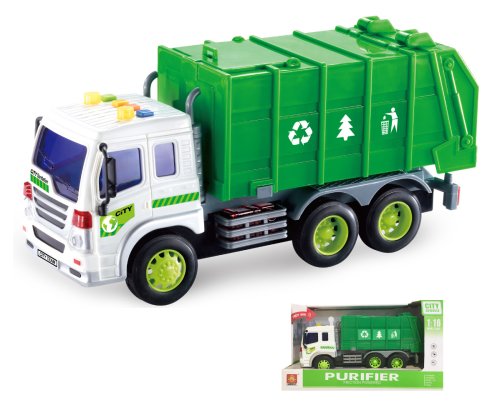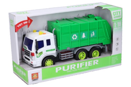 Auto popelářské s efekty. Velikost 28 cm. Na setrvačník. Světelné a zvukové efekty - tlačítka na kabině. 3xAG13 baterie součástí.