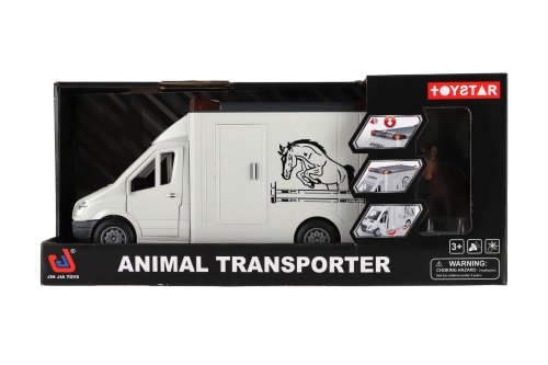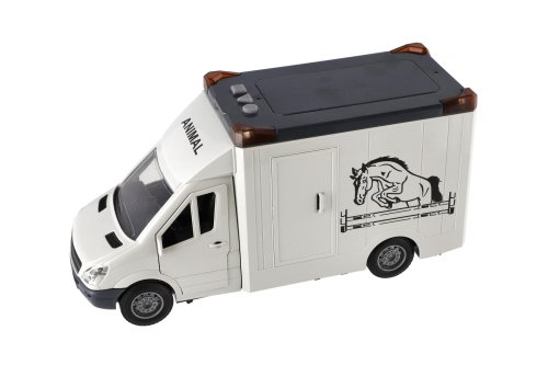 Auto pro převoz koní na setrvačník. Všechny dveře se dají otevřít. Součástí balení je postavička koně. Velikost auta je 28 cm a má světelné a zvukové efekty. 2x AA baterie jsou součástí balení. Rozměry balení 39 x 18 x 12 cm. Vhodné pro děti od 3 let.