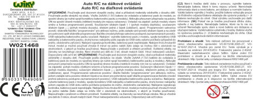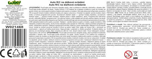 Auto RC na dálkové ovládání. Velikost 14 cm. Ovladač na zápěstí. Frekvence 2.4 GHz. Světelné efekty. Programování. Auto bateriový pack 3.7V, součástí ovladač 2xAAA nejsou součástí. Přepínač ON/OFF na autě. USB kabel součástí.