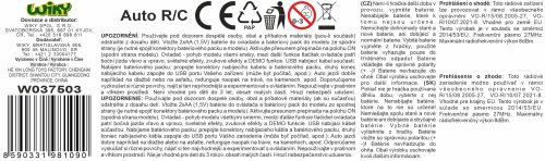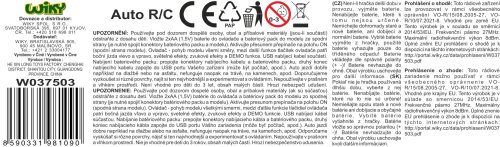 Auto RC na dálkové ovládání. Velikost 23 cm. Frekvence 2.4 GHz. Světelné a zvukové efekty. 3.7V 500mAh bateriový pack součástí, 2xAA do ovladače nejsou součástí. USB kabel součástí. Přepínač ON/OFF na spodní straně auta. Ovladač - Přední tlačítka - pohyb kolmo vlevo a vpravo, tlačítko - světelné efekty, - tlačítko - zvukové efekty, tlačítko - auto (demo).