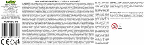 Auto s dobíjecí stanicí RC na dálkové ovládání. Rozměry auta 27,5x11,5x8 cm. Frekvence 2.4GHz. Světelné a zvukové efekty. Bateriový pack 3.7V 1200mAh do auta a dobíjecí stanice součástí, 2xAAA do ovladače nejsou součástí. Rychlost 15 km/h, provoz až 20 min, nabíjení 3,5 h, dosah 25 m. USB kabel součástí. USB vstup nad zadním levým kolem. Ovladač - přepínač ON/OFF, 6 světelných módů, automatické parkování, zvukové efekty.