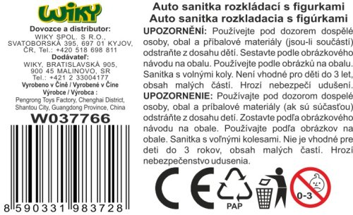 Auto sanitka rozkládací s 2 figurkami. Rozměry 30x9,5x14 cm. Volná kola. Obsahuje, auto, vnitřní vybavení, 2 figurky, polepy. Obrázkový návod na sestavení a používání na zadní straně obalu.