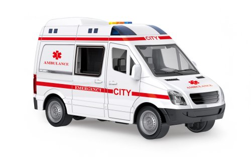 Auto sanitka s efekty. Rozměry 21x10x11 cm. Na setrvačník. Otevírací přední a zadní (posuvné) dveře. Světelné a zvukové efekty tlačítky na střeše. 3xAG13 baterie do střechy součástí.