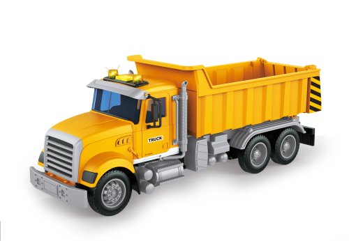 Auto sklápěč s efekty. Rozměry 31x9,5x11 cm. Na setrvačník. Světelné a zvukové efekty tlačítkem na kabině. 3xAG13 baterie do střechy součástí. Sklopná nakládací plocha uvolněním pojistného tlačítka na boční straně pod nakládací plochou. Otevíratelná zadní část nakládací plochy.