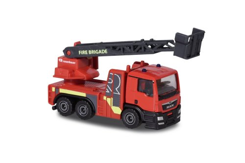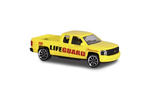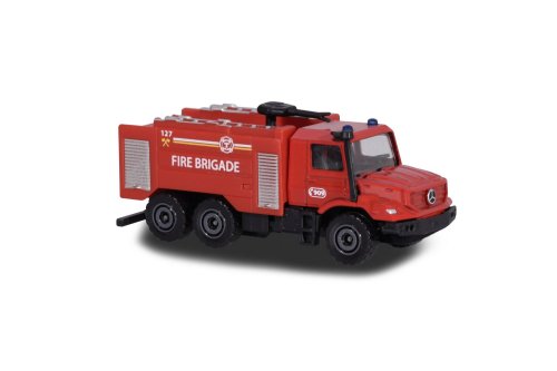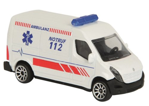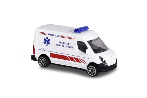 Kovové auto na volnoběh, mezinárodní verze. Pohyblivé a/nebo otevírací části. Délka 7,5 cm. 6 druhů: Chevrolet Silverado, hasičské auto MAN TGS nebo Mercedes-Benz Zetros, ambulance Renault, policejní auto VW Amarok nebo Porsche Panamera.