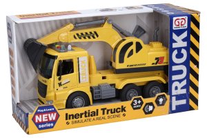 Auto stavební bagr na setrvačník s efekty. Velikost 28 cm. Vydává světelné a zvukové efekty. Aktivace tlačítky na střeše (1 tlačítko - zvuk motoru, zvuk bagrování, 2 tlačítko - zvuk couvání, zvuk troubení. Baterie 3xAG13, součástí (1,5V). Otevíratelné dveře, pohyblivé rameno bagru, na setrvačník.