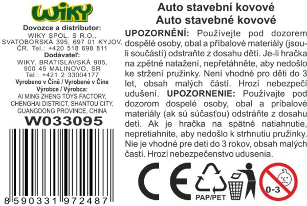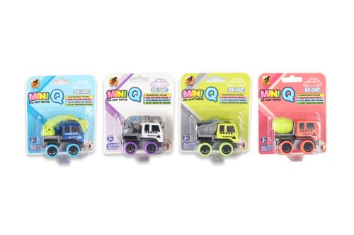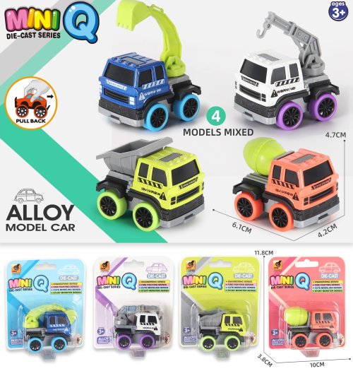 Auto stavební kovové. Rozměry 6,1x4,2x4,7 cm. Na zpětné natažení. 4 varianty - bagr, jeřáb, sklápěč, domíchávač.