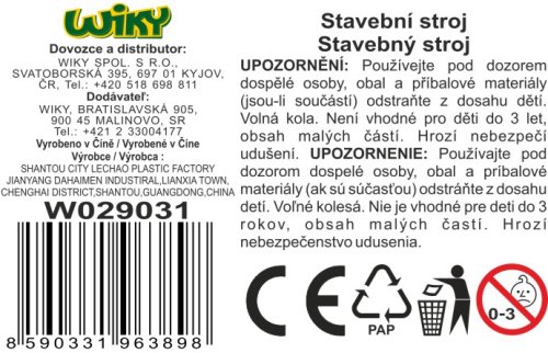 Auto stavební stroj. Velikost 12 cm. 3 varianty - sklápěč, buldozer, bagr. Sklápěč má sklápěcí korbu. Bagr a buldozer mají polohovatelné lžíce. Volná kola.