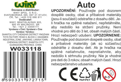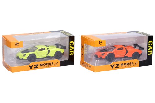 Auto kovové. Rozměry 12x5x3 cm. Na zpětné natažení. Otevírací dveře a zadní okno. 2 varianty - zelená, oranžová.