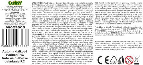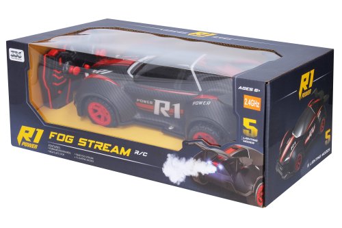 Auto závodní RC. Rozměry 28x16x8 cm. Světelné a kouřové efekty. 5 světelných módů. Frekvence 2.4 GHz. Rychlost 12 km/h. Bateriový pack 3.7V 500mah do auta součástí, 2xAA baterie do ovladače nejsou součástí. USB kabel součástí. Nabíjení 2 h. Provozní doba 25 min. Dosah 25 m. Přepínač ON/OFF na spodní straně auta. ON/OFF tlačítko mezi páčkami na ovladači. Levé tlačítko na ovladači - kouřové efekty. Pravé tlačítko na ovladači - přepínání světelných módů. Nádržka na vodu na střeše auta. Nádobka na vodu součástí.