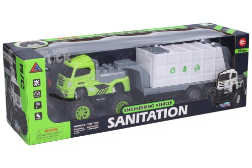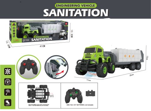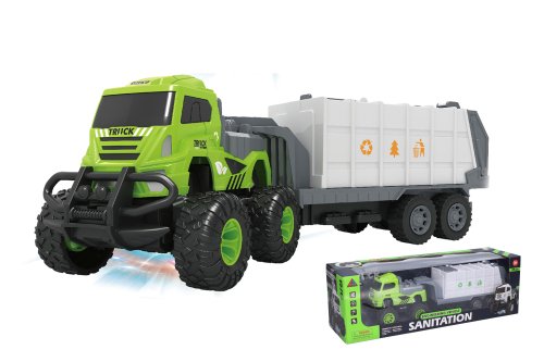 Auto tahač úklidový RC na dálkové ovládání. Rozměry 35x11x12 cm. Světelné efekty. 3xAA baterie do auta, 2xAA do ovladače nejsou součástí.