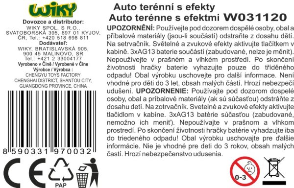 Auto terénní s efekty. Rozměry 23x12,5x10,5 cm.
