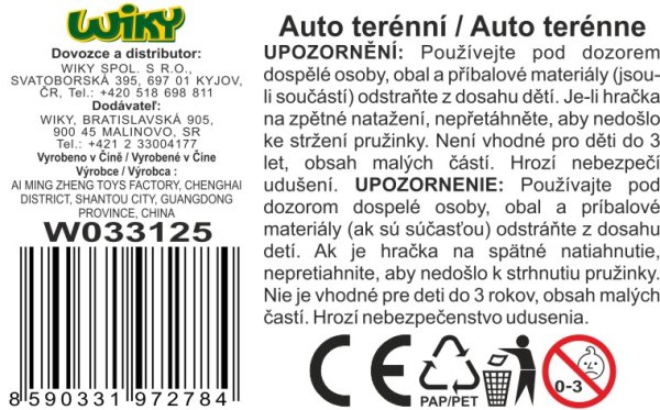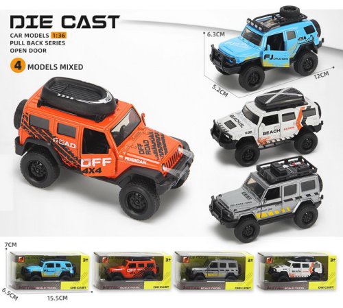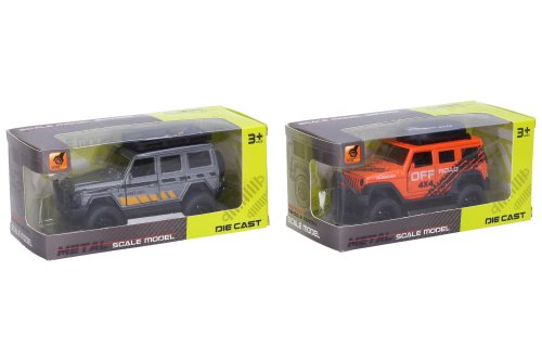 Auto terénní kovové. Rozměry 12x5,3x4,9 cm. Na zpětné natažení. Otevírací dveře. 4 varianty - oranžová, modrá, bílá, šedá.
