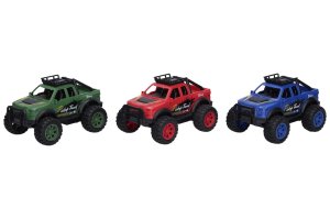 Auto terénní na setrvačník. Přesné rozměry auta 13x8,5x8 cm. Display box - 9 ks. 3 varianty - červená, modrá, zelená.