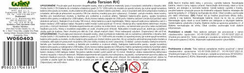 Auto Torsion Car RC na dálkové ovládání. Rozměry 31x18,5x8 cm. Frekvence 2.4GHz. Světelné efekty. Bateriový pack 3.7V 1200 mAh Li-ion do auta součástí, 2xAA baterie do ovladače nejsou součástí. Nabíjecí USB kabel a šroubovák součástí balení. Ovladač - tlačítko deformace, tlačítko světelné efekty, tlačítko zvukové efekty. Provoz 15-20 min, nabíjení 3 h, dosah 15-20 m.